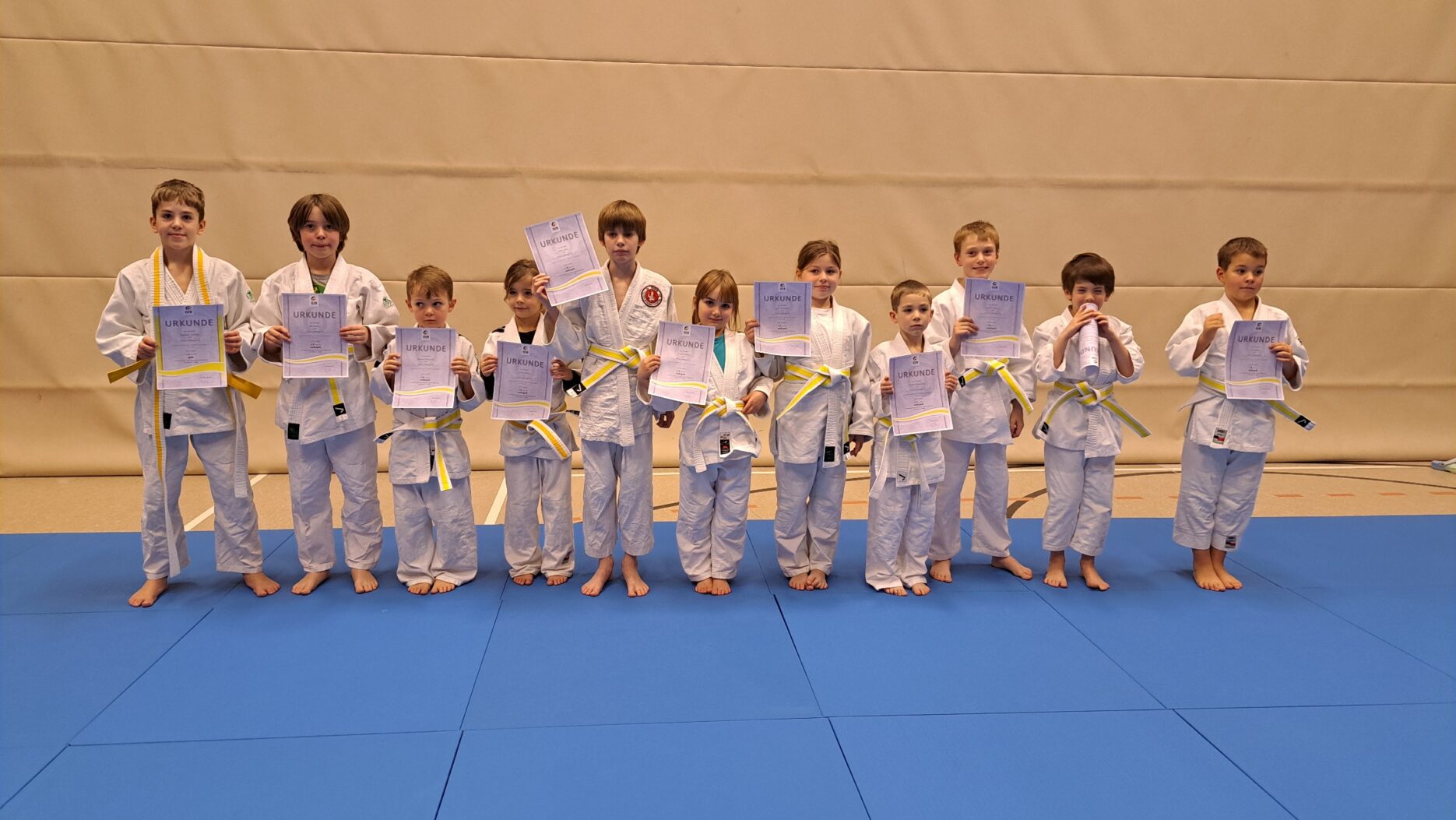 Traditionell findet zum Jahresende eine Gürtelprüfung statt, bei der alle, die das Jahr über fleißig trainiert haben, die nächste Gürtelstufe erwerben können. Als erstes waren um 17:00 Uhr unsere neuen Mitglieder dran: 10 Kinder, die erst im September mit Judo begonnen hatten, konnten eine Falltechnik, einen Wurf und eine Haltetechnik zeigen und erklären, was im Judo wichtig ist: Gemeinsames Lernen und Kämpfen mit Höflichkeit, Respekt und Wertschätzung für die Trainingspartner. Dafür erhielten sie alle den weiß-gelben Gürtel. Um 18:00 Uhr waren dann unsere fortgeschrittenen Judoka dran: Unter den kritischen Augen von Prüferin Monika Birk und Trainerin Jana Förtsch bestanden erfolgreich: Mattis Forrer die Prüfung zum orange-grünen Gürtel, Niclas Noack, Simon Weber, Maxim und Alexis Würtz zum orangen Gürtel, Paula Schömer und Yasin Naser zum gelb-orangen Gürtel und Mischa Leshehyk und Alexander Zimmermann zum gelben Gürtel. Das nächste Probetraining für alle ab 6,5 Jahre findet im 1. Quartal 2026 statt. Anmeldung und Infos unter judo-tg04.de.